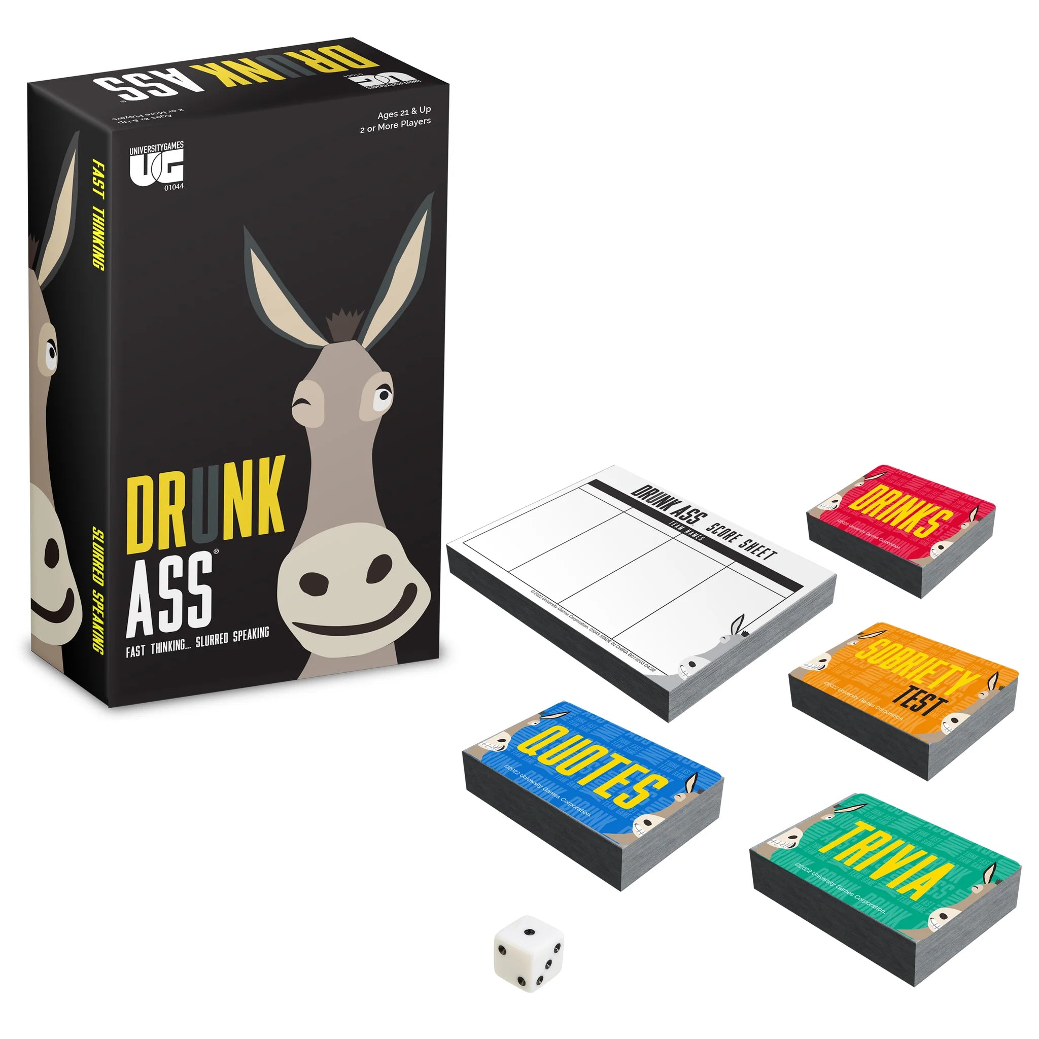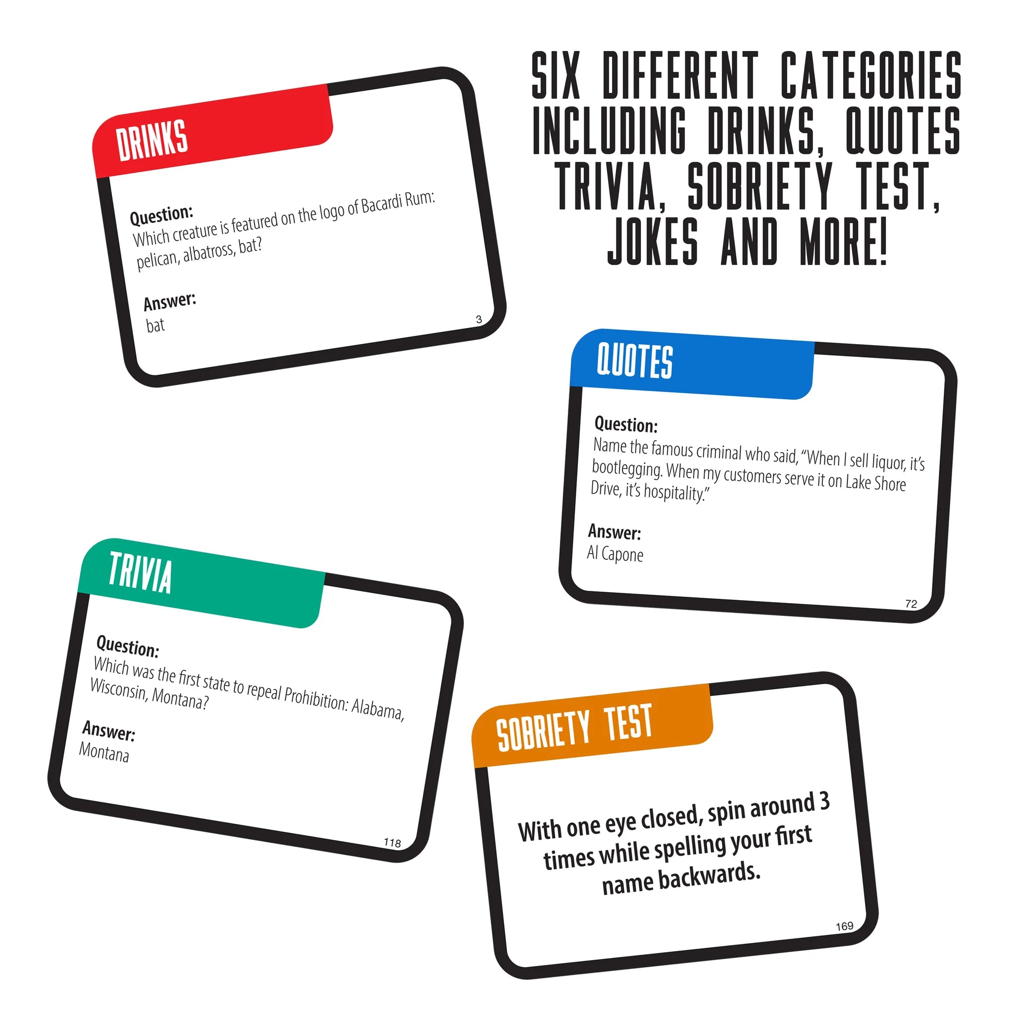 Introducing Drunk Ass, the game of fast thinking and slurred speaking! Drunk Ass is the classic team trivia game that will keep you laughing and drinking all night long! This game will test your wits before, during, and after you toast with your favourite beverage. Loaded with hundreds of different questions and challenges, all you need to play are glasses, some liquids to imbibe in, and a few good friends! You'll encounter questions like: Which of these is NOT one of the five official classifications of whisky: Irish Whisky, Scotch Whisky, Australian Whisky, Canadian Whisky, or American Whisky? And Sobriety Test Challenges like: Say, "antidisestablishmentarianism" 5 times quickly. (Honestly, we won't judge you if you can't say it once!) Grab your copy of Drunk Ass and see where fun trivia and test challenges take you! This game is intended for adults 18 and up. Please drink responsibly.