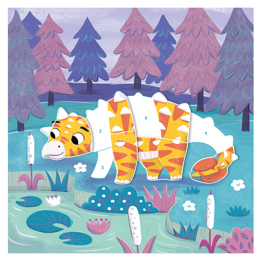 Create 12 vibrant prehistoric scenes with over 100 colourful stickers. Match the numbered stickers to the spaces on the page to complete each dinosaur scene.