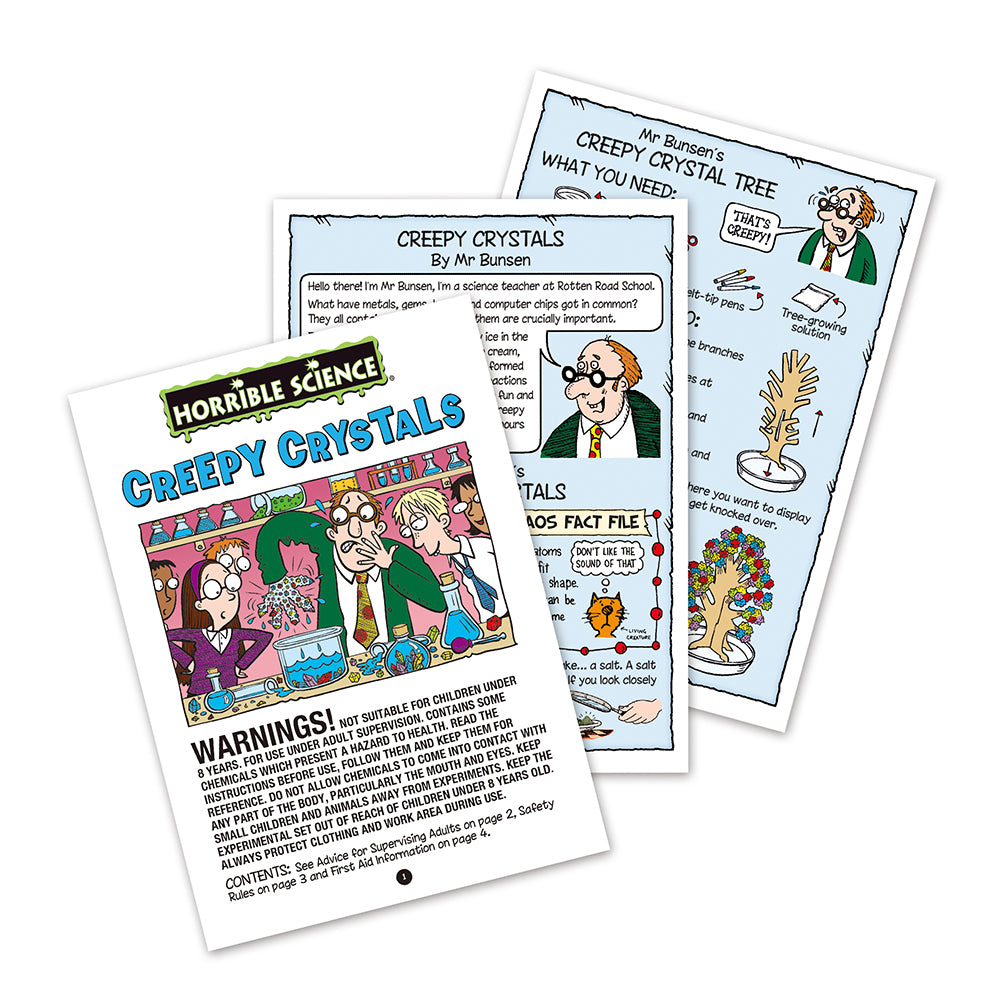Grow a creepy crystal tree, create your own diamonds and make crystals that rock! Discover how crystals form and foul facts about crucial crystals. Contents: Ammonium dihydrogen orthophosphate 50g, tree growing solution, tree card, Petri-dish, colour tablet, seed crystal, round bottle, funnel, limestone rock and Horrible Info leaflet.