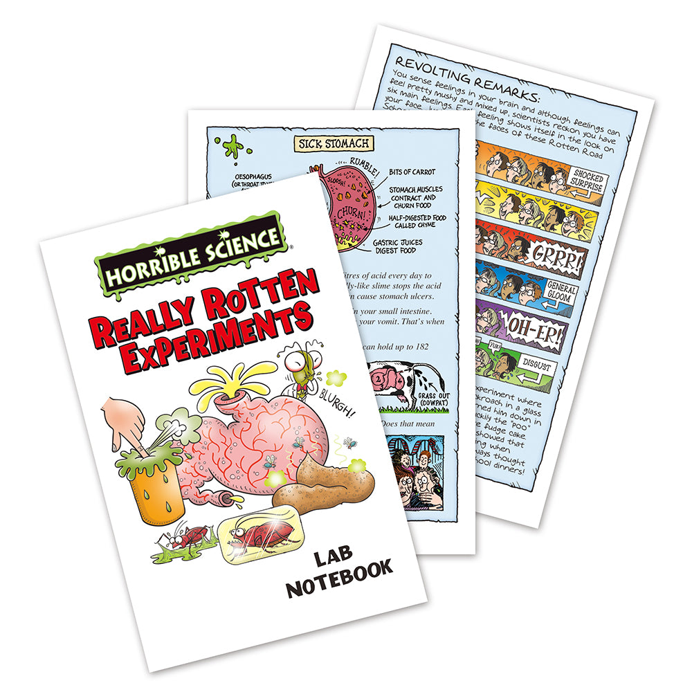10 fiendishly rotten experiments! Hide a cockroach in soap, mould a fake poo and make your own vile vomit and ghastly green slime! Contents: plastic stomach, vinegar, funnel, bicarbonate of soda, goggles, plaster of Paris, poo mould, paints and paintbrush, green food colouring, fart pot, glycerine soap pieces, beaker, microwave tray, soap mould, pipette, plastic cockroach, 36-page Top Secret Lab Notebook.