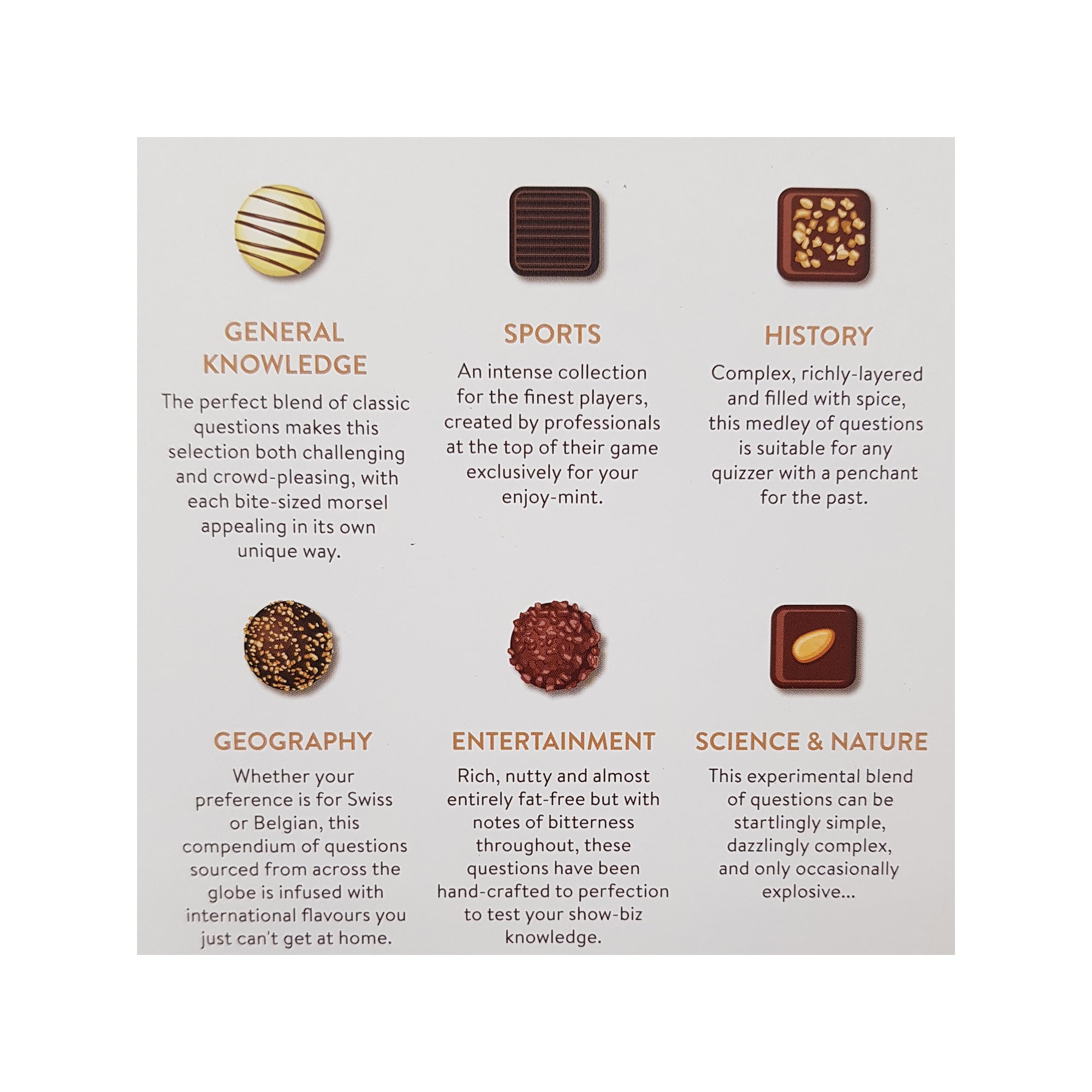 - 300 questions printed on 300 cards inside a chocolate box style tray