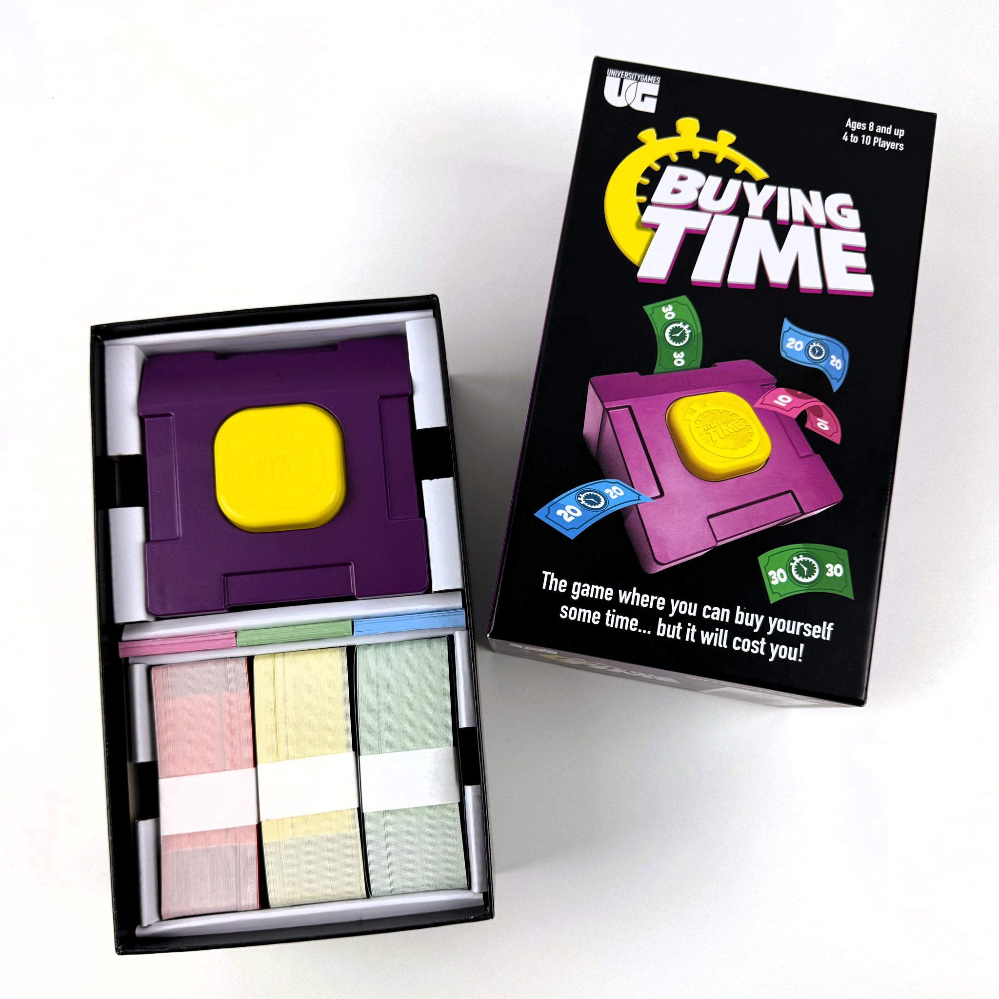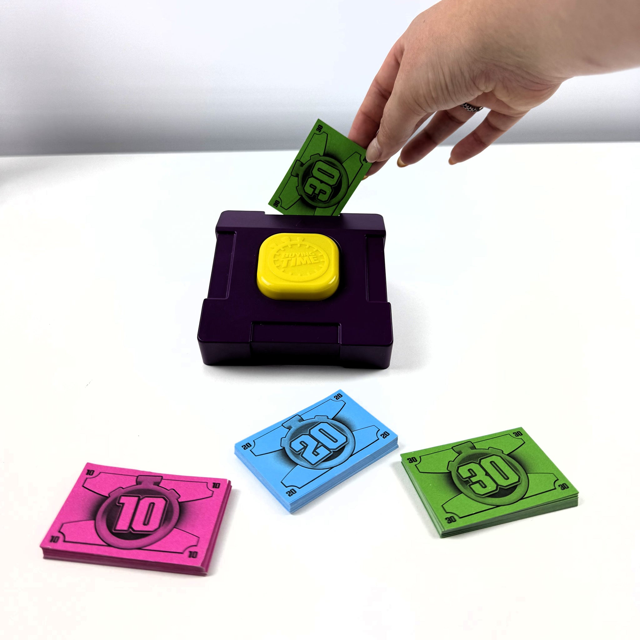 The game where you can buy yourself some time...but it will cost you! Unlike any other board game, Buying Time is the game where you decide how much time you and your team need to answer the questions, but how much are you willing bet to earn more money! Use the clever money counter to insert your money, the money converts to time. But how much time do you really need for your team mates to answer all the questions on the card?