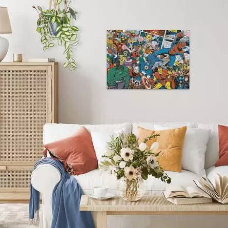 Spiderman, The Hulk, Ironman, Captain America, Thor, Black Widow, Spiderwoman and many more Marvel characters assemble on this colourful and complex “CHALLENGE” puzzle.