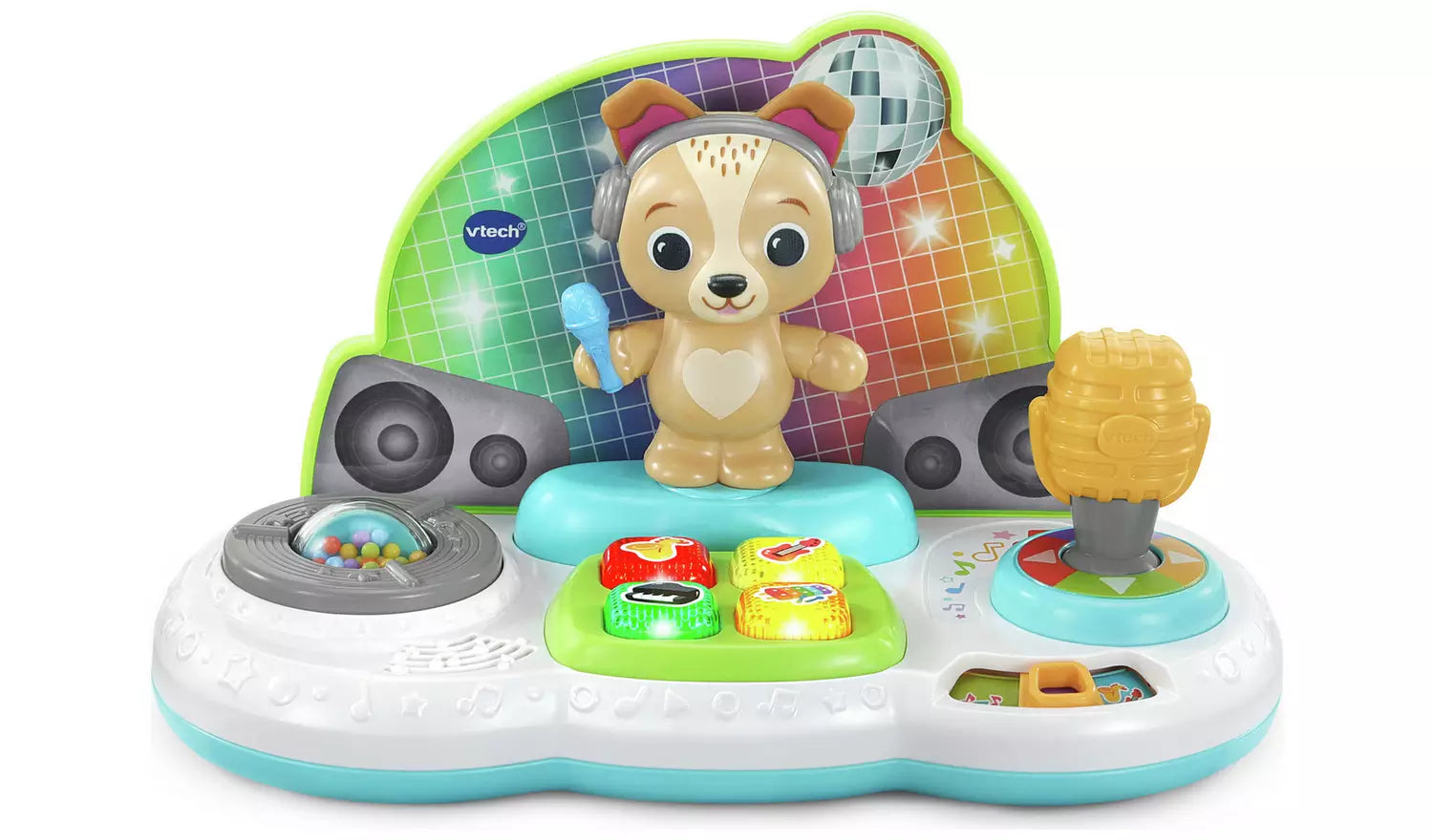 Get this musical party started with the delightful DJ Jams Puppy! Press the Saxophone, Guitar, Piano or Xylophone buttons to hear each instrument's sounds. With music, learn and play modes, discover over 60 songs, melodies, sounds & phrases. Watch the lights flash to the music, encouraging little ones to bop to the beat. Move around the microphone joystick to make puppy dance! Twist and slide the turn table for DJ scratch sounds and cute phrases, whilst beads in the centre bounce around. This is a groovy introduction into the world of music for little performers!