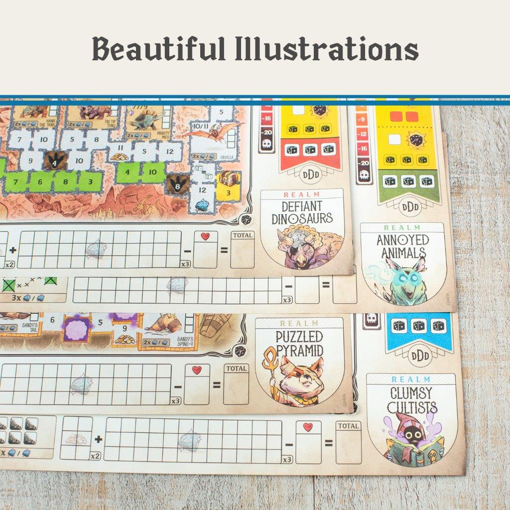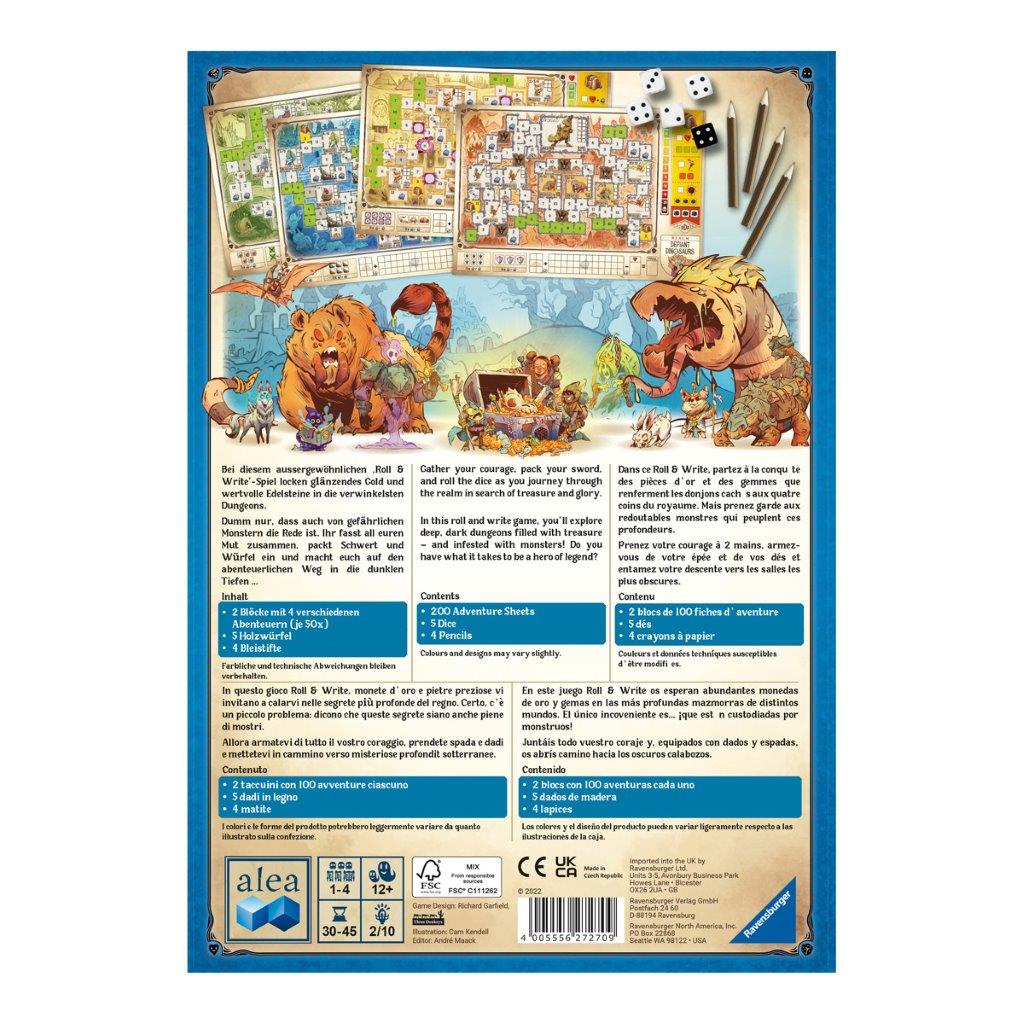 Gather your courage, pack your sword and roll the dice as you journey through the realm in search of treasure and glory. In this roll & write game, players use dice rolls to advance further through the dungeon map, fight monsters and collect treasure on their way to victory. Collect the most Victory points to win! Do you have what it takes to be a hero of legend? An exciting roll & write game for adventurers – Roll the dice to travel through 4 different dungeons, marking off your spaces as you go. Defeat monsters and collect the most treasures to gain Victory points to win!