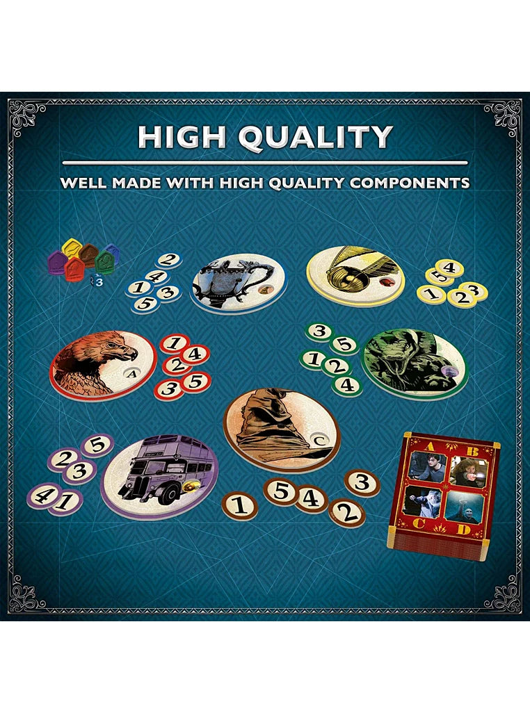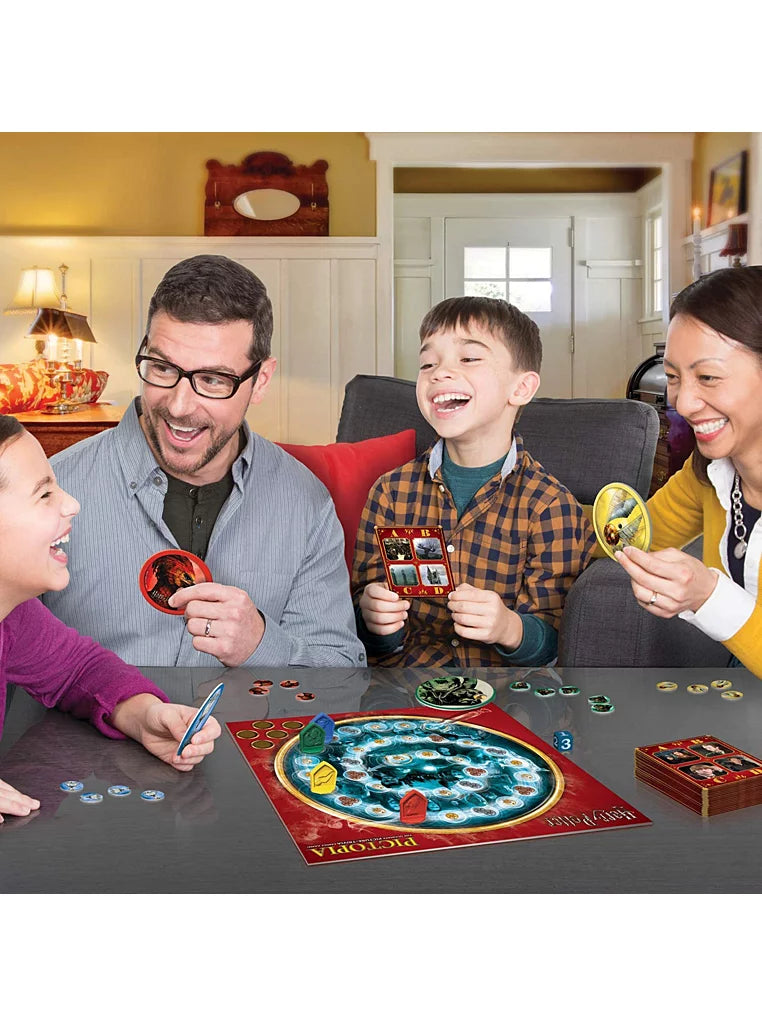 Showcase your knowledge of J.K. Rowling's wizarding world when you encounter 1,000 picture trivia questions featuring the beloved characters, extraordinary places, magical creatures, and enchanted objects from the epic Harry Potter movies. It's a game of teamwork - with a competitive twist! Sometimes you'll work together and other times answer alone, but you'll wager your points every time! How much you wager will depend on how well you know the pictures on the card, before you hear the question! Along the way are guess-my-answer questions that reveal how much you know about the other players! Make Family game time Enchanting!