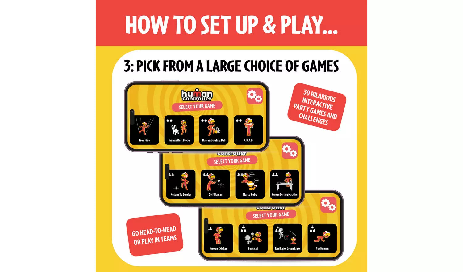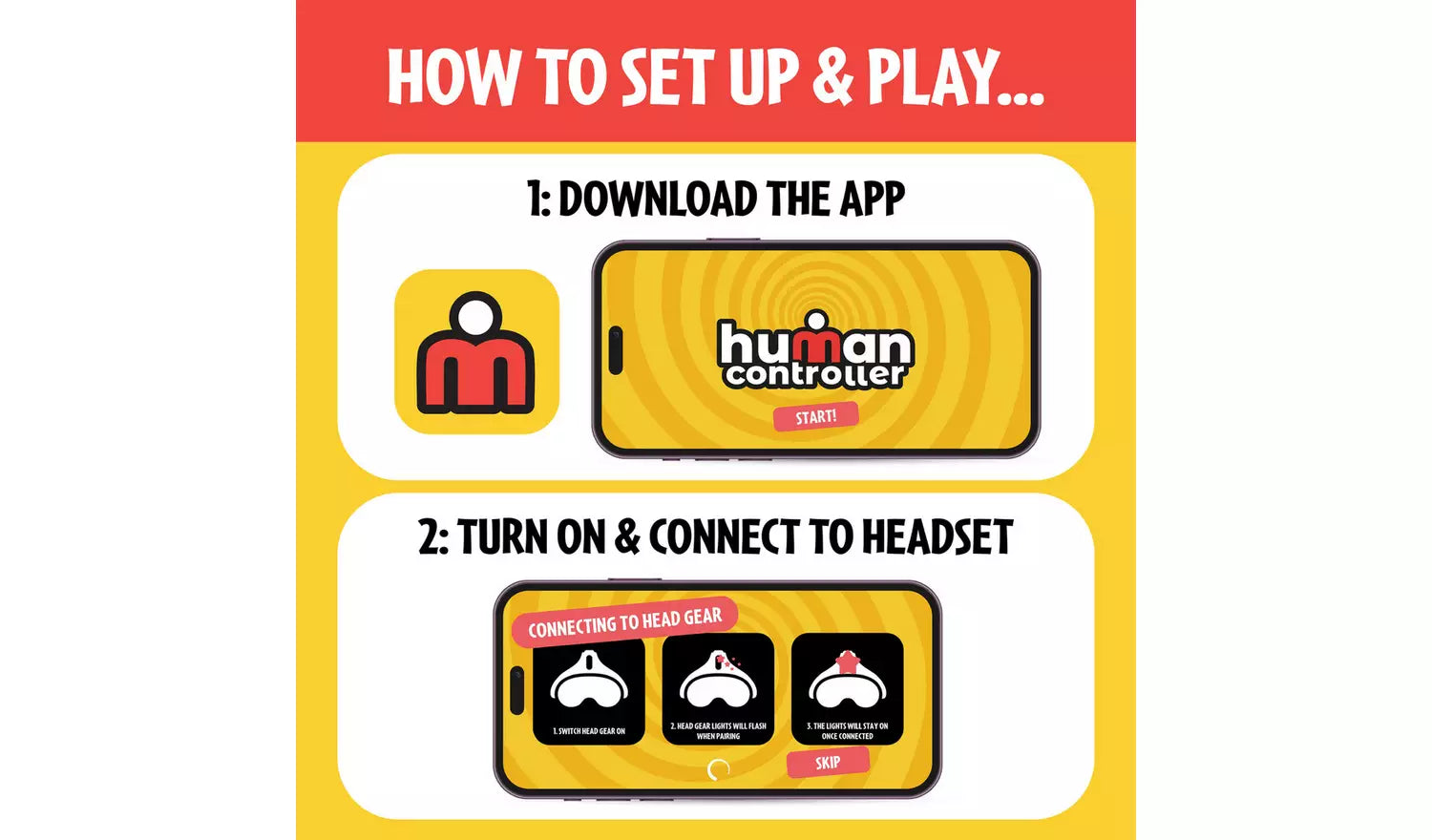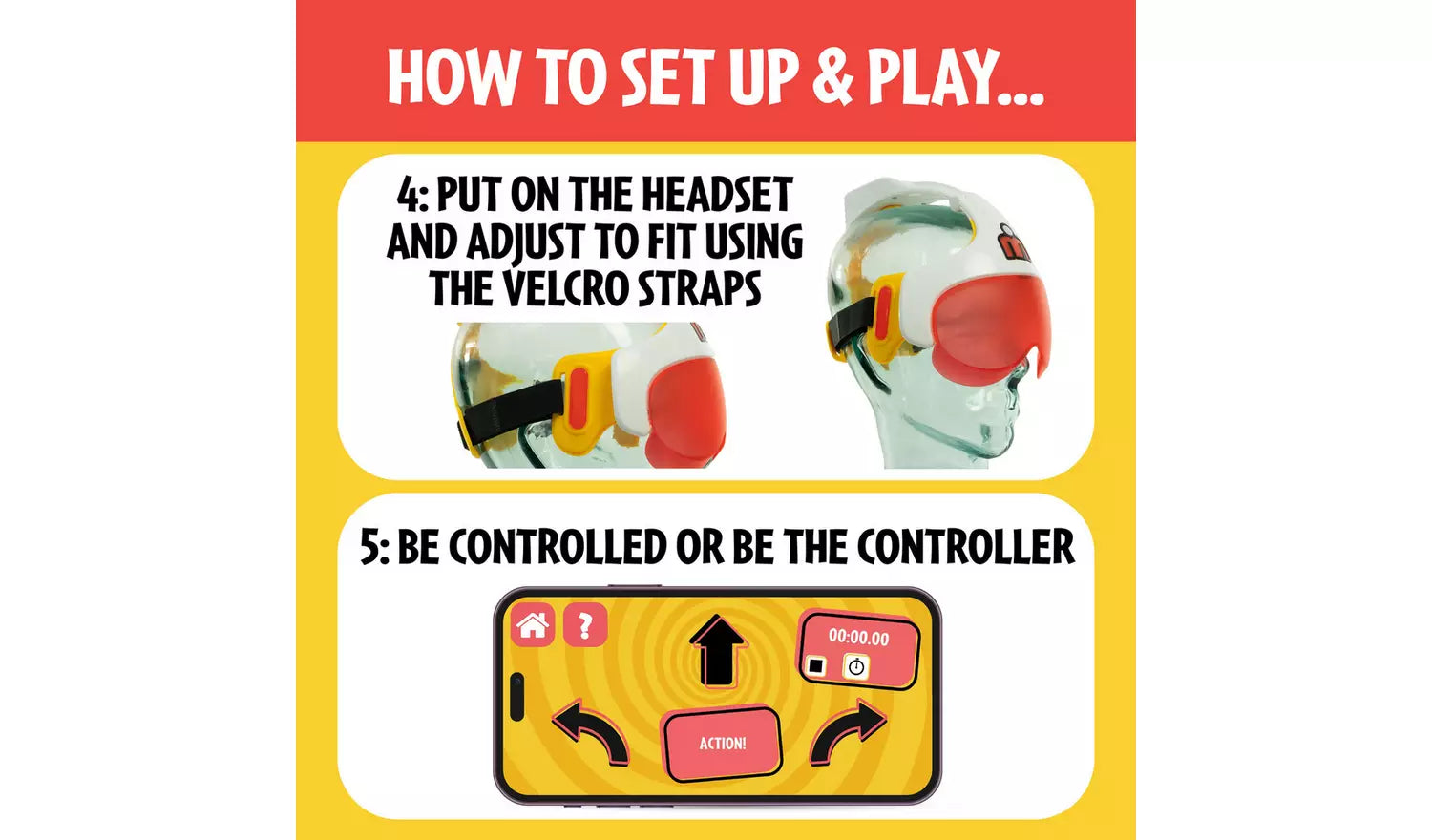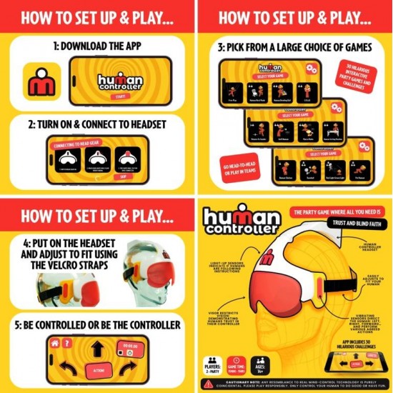 Ever wished you could have more power over your fellow human beings? Well now you can. Take one Human and one Controller and put them together. The human wears the headset which acts as a blindfold and a command module. The catch? Someone else controls the headset and tells the human what they must do. It's fun to watch and fun to play. Setting up the game is quick and easy. Download the Human Controller app onto a device of your choice, decide whether players will go head-to-head or play in teams, then take turns with the headset and the app.