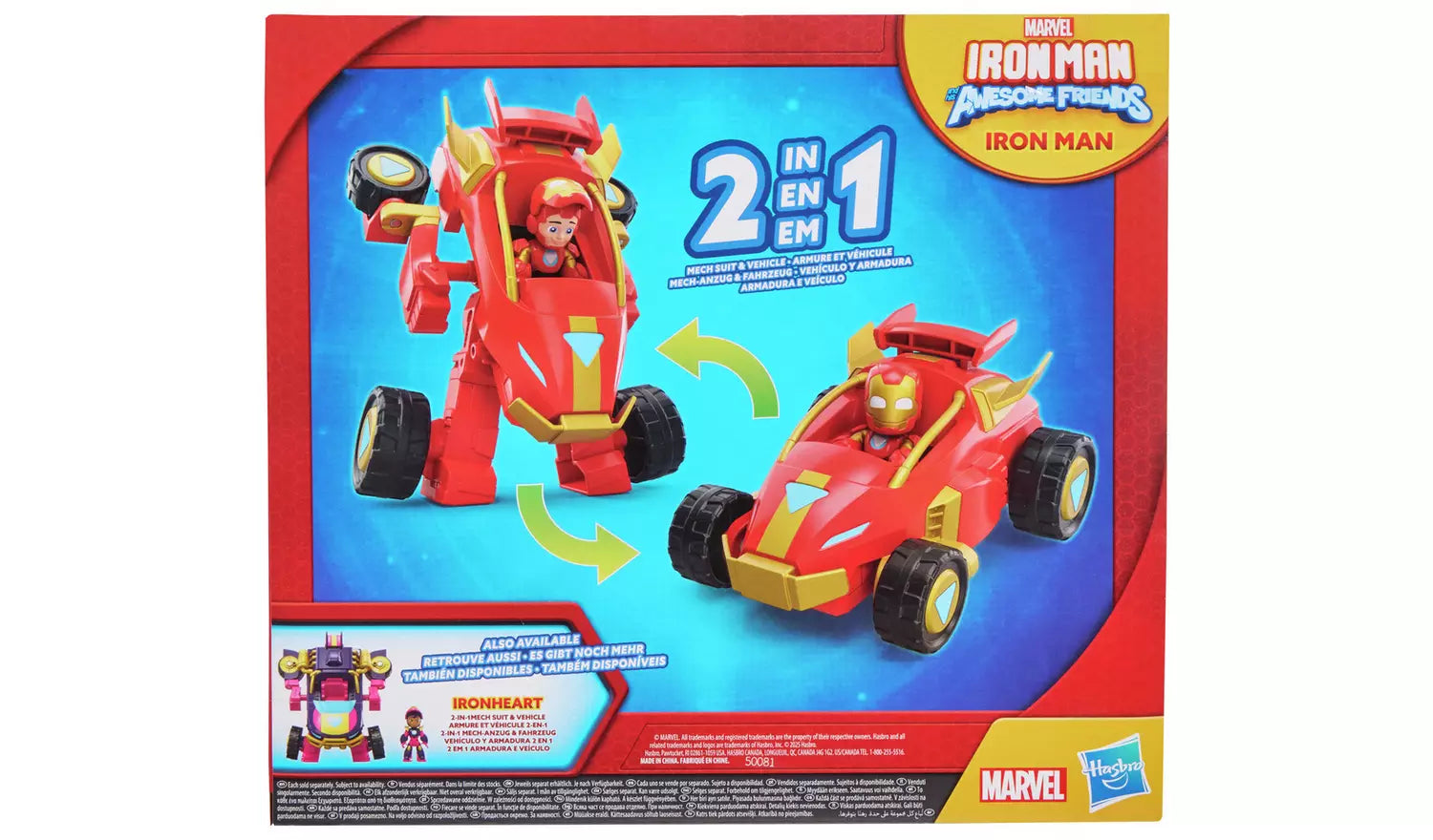 Join Team Iron Man on the latest armoured-up adventures with this 2-in-1 Mech Suit & Vehicle figure and toy car set! This vehicle toy comes with an included 7.6-cm (3 inch) Iron Man action figure, featuring hero reveal action. Just flip up the mask to reveal the face of Tony Stark, then flip it down to armour up as Iron Man! Toy vehicle converts from mech to vehicle or vehicle to mech in four easy steps. Figure can even stay inside during conversion!