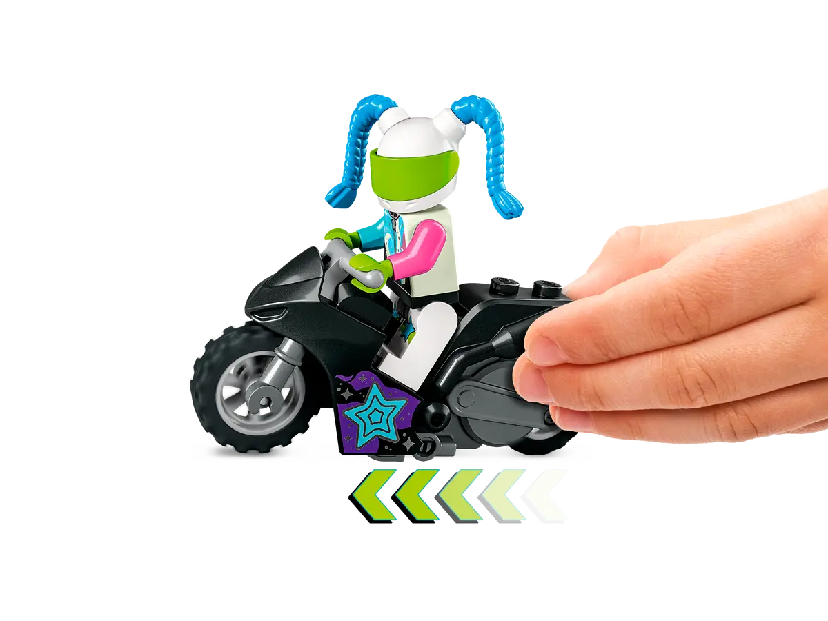 - What’s in the box? – All kids need to build The Knockdown Stunt Challenge, a flywheel-powered stunt bike and LEGO® City Adventures TV series minifigure characters Galactic Poppy Star and Harl Hubbs
