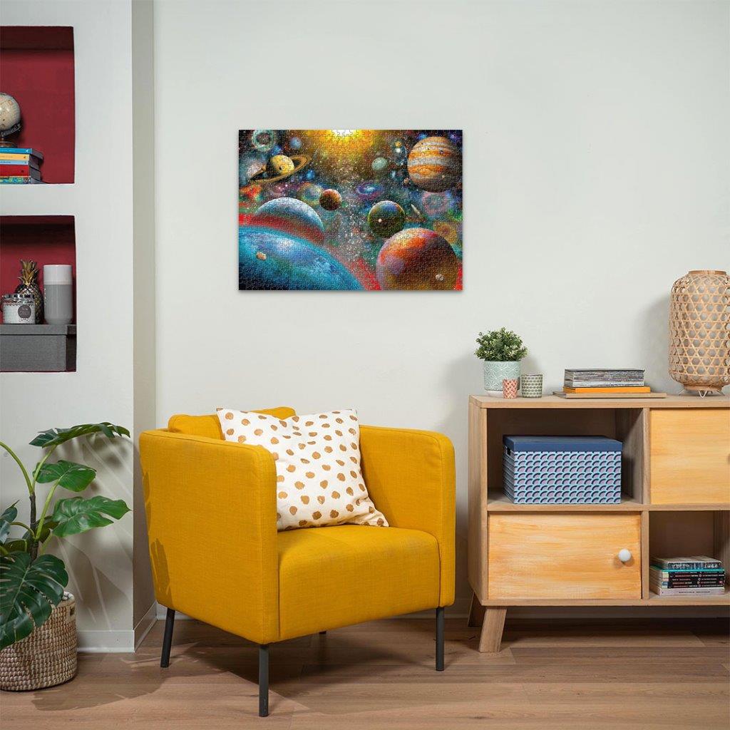 Piece together an "out of this world" scene featuring planets, stars, the sun and other breath taking elements of our gorgeous galaxy in this 1000 piece puzzle. Escape the stresses and strains of our world, and escape into a "cosmic" experience. Suitable for astrology fans, space travellers, and anyone wanting a challenging and different design.