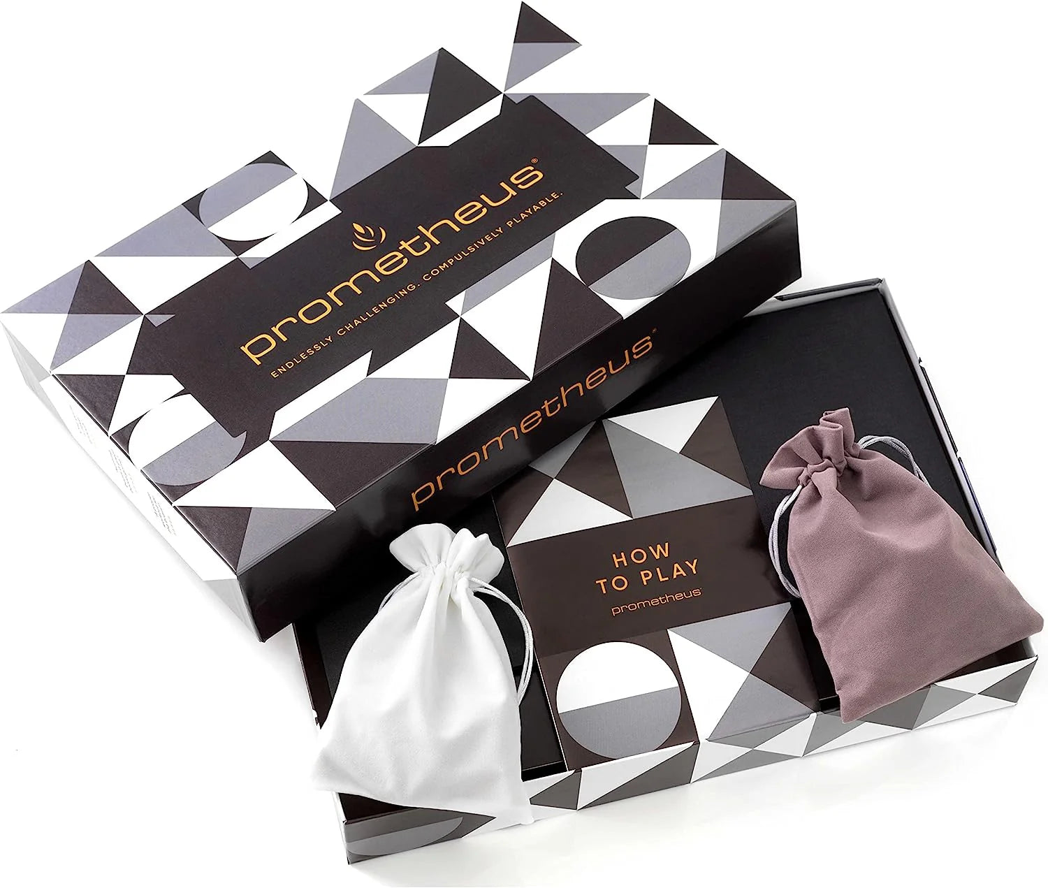 Prometheus is the new classic strategy game. The game is simple to learn, impossible to draw at, and no two games are alike. Prometheus is similar to chess, but faster and more dynamic. Prometheus offers a high-quality kit that includes 50 play pieces, a foldable board, and two hand-stitched play-piece bags. It's the ideal gift for a friend or family member, or even for you. The goal is to capture your opponent's treasured sphere, and the moves are based on how many corners each piece has. Prometheus can be used to improve strategic thinking and foresight. It encourages self-confidence, teamwork, and positive communication skills. The game focuses on moves that can be made on a chess-like board and is designed to help people overcome arithmetic fear. The strategy options are intriguing, with seemingly limitless opportunities for problem-solving & risk-taking.