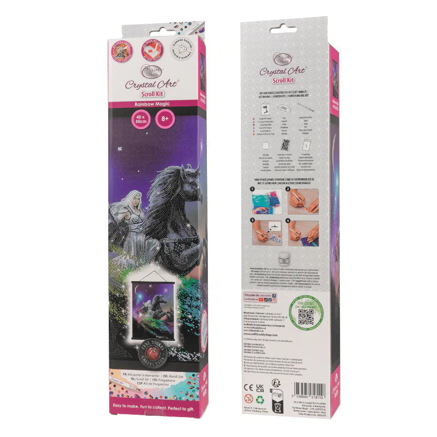 Unleash your creativity with the stunning 'Rainbow Magic' Crystal Art® Scroll Kit from Craft Buddy. The captivating design showcases a gothic female warrior astride a majestic black unicorn, set against a deep violet night sky. Her magical staff casts a radiant rainbow spell that arcs across the scene, blending drama with vivid colour. Each coded gem adds shimmering detail to the fantasy artwork, bringing the image to life with every sparkling facet. Perfect for fantasy art enthusiasts, this eye-catching piece makes a bold and mystical statement in any room or creative space.