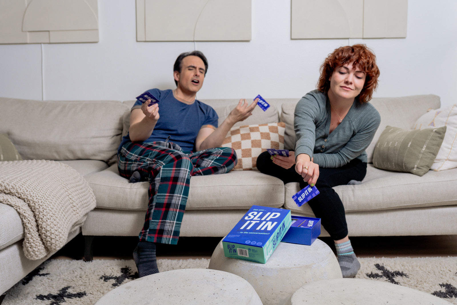 HOW TO PLAY: 1) Each player starts the game with 5 slips of random phrases. 2) Players must try to slip their phrases into natural conversation without getting busted. 3) The first player to successfully "Slip It In" five times wins the game!