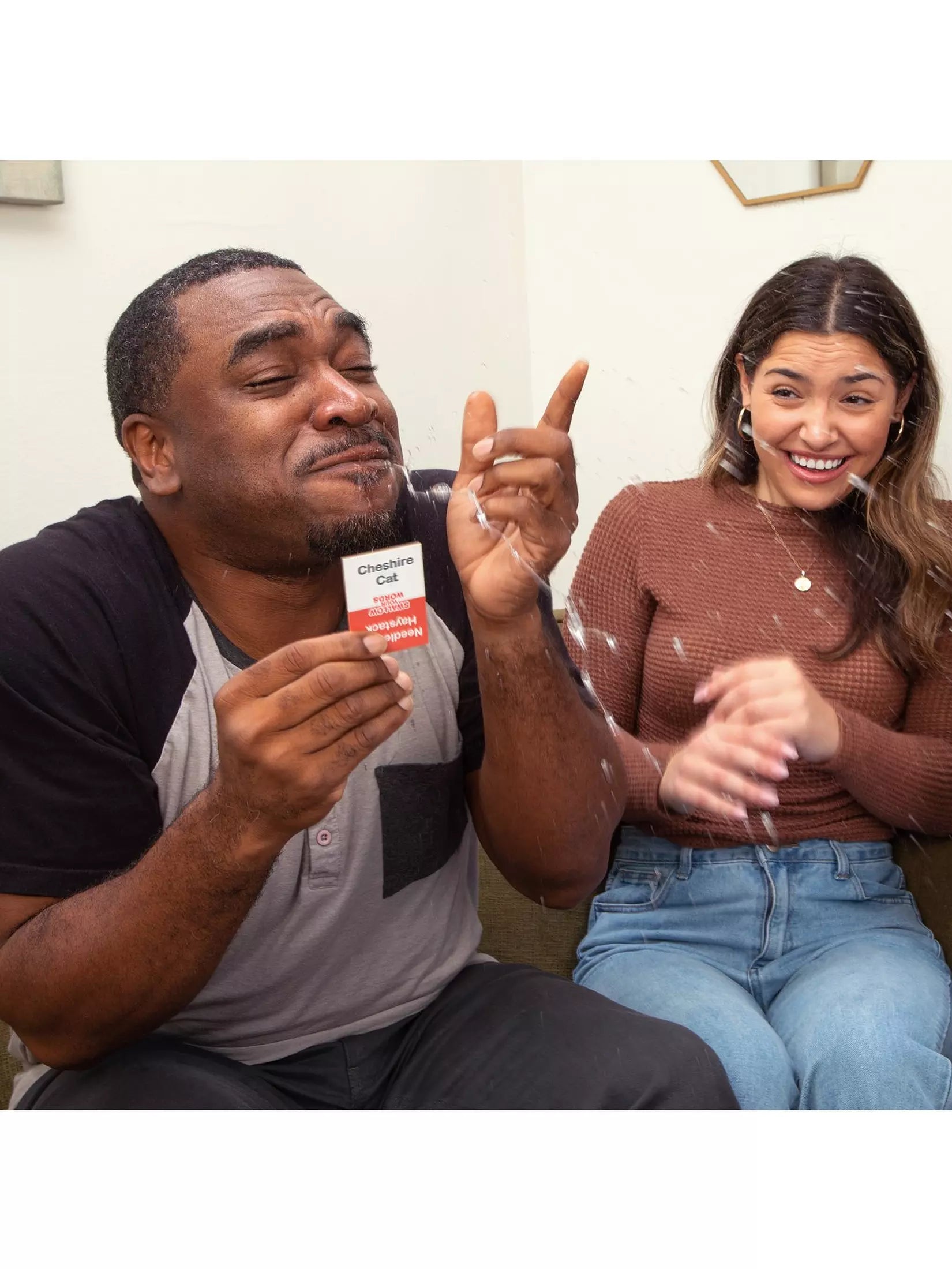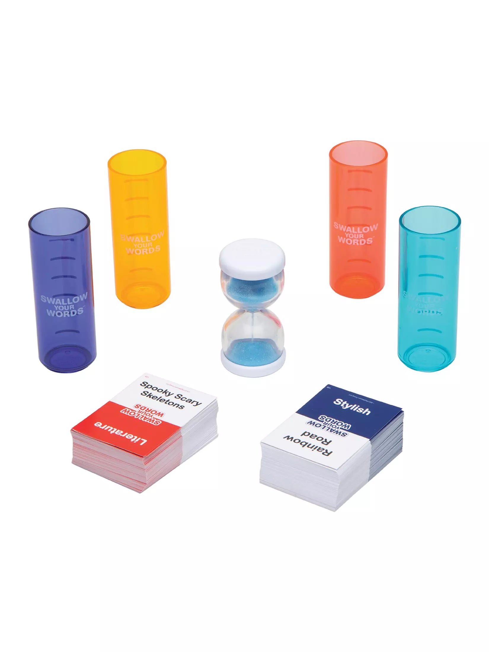Sip it, say it, and don't you dare spray it in the hilarious family party game Swallow Your Words! Read the cards out loud with a mouth full of water, and let the fun begin! Can the other players guess what you're trying to say before you spray? This game comes with 4 cups, 800 words and phrases on 200 cards, a timer, and instructions. For 2-4 players ages 8 and up!