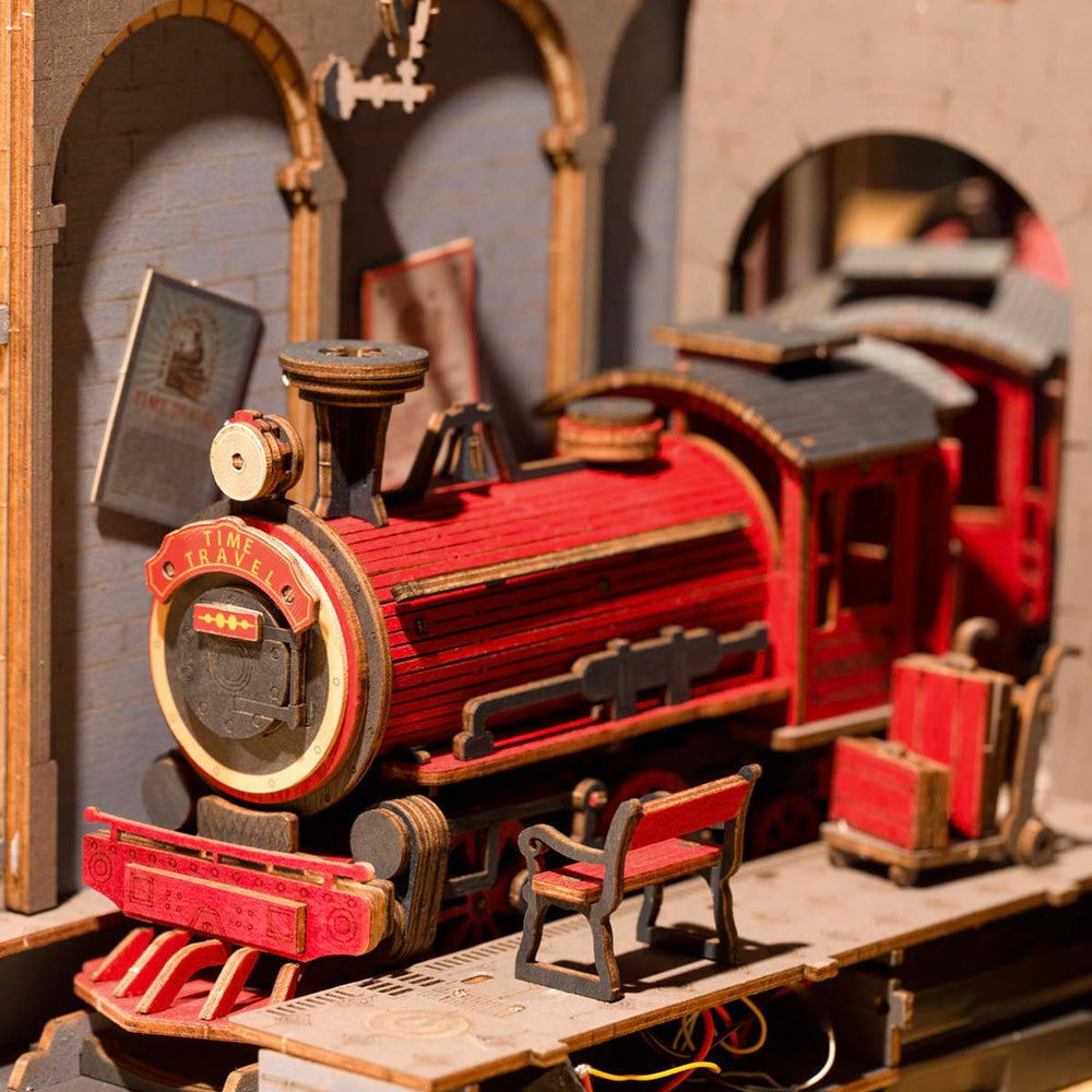 Robotime-Rolife Time travel Book Nook TGB04 3D wooden DIY miniature dollhouse kit is a train station that can take you to a different time and space. We have provided you with all the pieces and tools for you to create this cool miniature station scene. Have fun assembling all the parts together, and you'll get a unique book nook shelf insert and home decor! Hurry up, the train is about to leave!