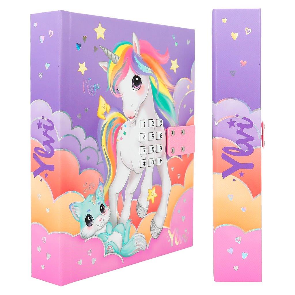 - This captivating Unicorn diary is designed for children aged five and above. The cover has a whimsical array of fantasy-themed illustrations featuring our delightful unicorn, Naya, with her pastel rainbow mane. Accompanying Naya is the adorable creature Luna, both set against a mystical backdrop of stars, clouds and a smiling crescent moon - a dreamy canvas that sparks creativity and joy.