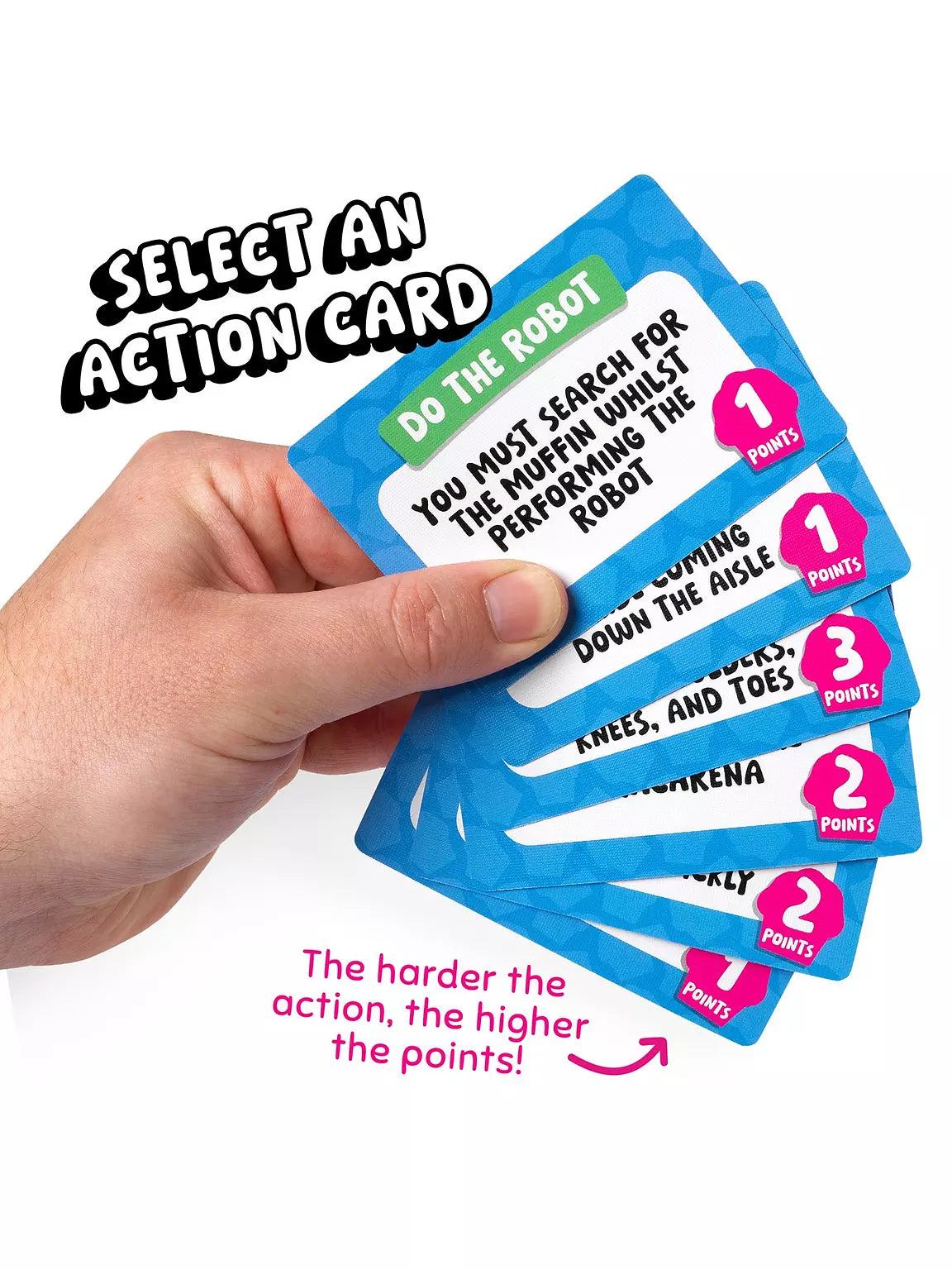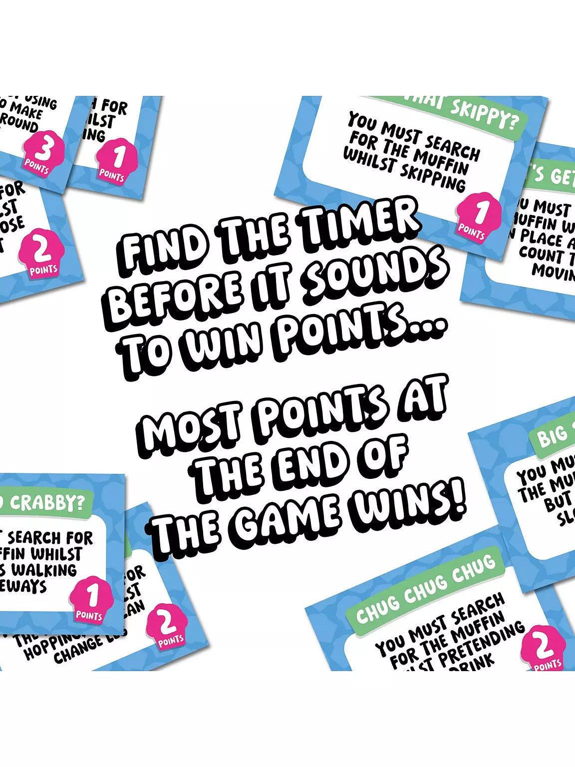 Hide the muffin, give it a twist and the timer will start. Players must sniff out the muffin before time is up. But there's a catch! While you seek, you have to do what's on your card; buzz like a bee, hop like a kangaroo or walk backwards - there's 100 unique challenges included. Be the first to find the muffin, claim the points on your card and muffin can stop you from winning!